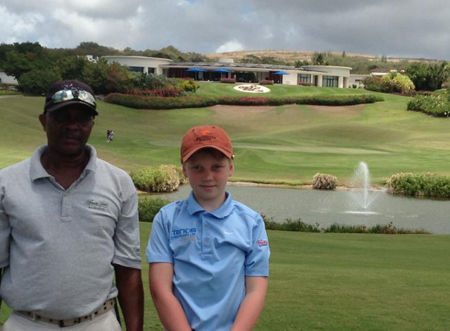 Me & my caddie Rudolph on the 18th at Sandy Lane Golf Club. 190 yard par 3 over water into wind playing around 220 yards, caddie pulls out 3 wood hit the green 2 put par beat Dad by 5 shots, result pay up Dad!! You buy the beer – I could do with a cold one! : )